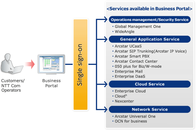 | ■Centralized management | Business Portal enables you to visualize and manage cloud, network, voice, application, data center and security and other services in one screen with single ID and password. |