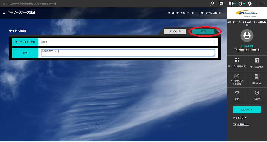 2.ユーザグループ一覧画面の「グループ追加」を選択します。グループ名の入力欄が表示されるので、グループ名を入力します。