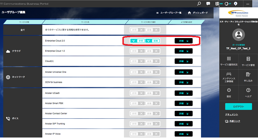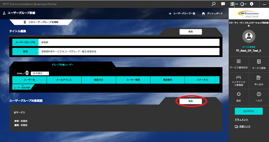 3.アクセス可能範囲を選択します。ユーザグループ対象選択の「編集」をクリックし、サービス単位もしくは、サービス内の契約単位で[参照]と[編集]の権限を指定します。なおArcstar Universal OneやArcstar IP Voice等のグループという概念があるサービスについては、グループ番号(V、Y番)での指定も可能です。