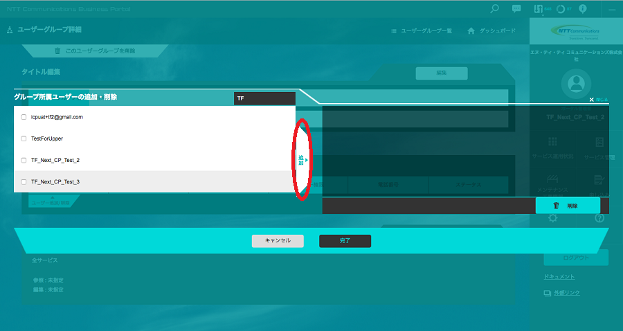 4.次に作成したユーザグループにユーザを追加します。「ユーザー追加/削除」をクリック後、作成したグループに所属させたいユーザのチェックボックスをチェックし「追加」ボタン登録します。チェックしたユーザが右側に移ったことを確認し、完了をクリックします。