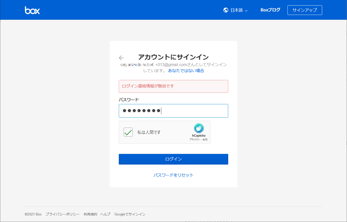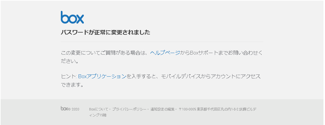 パスワードリセットリンクは送信後3時間で期限切れになります。期限切れになった場合は、https://app.box.com/reset にアクセスして、新しいリンクを再送信してください。