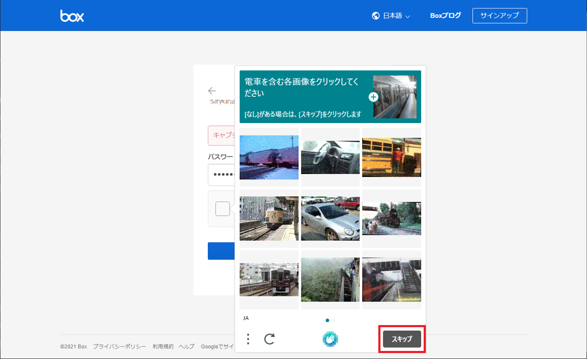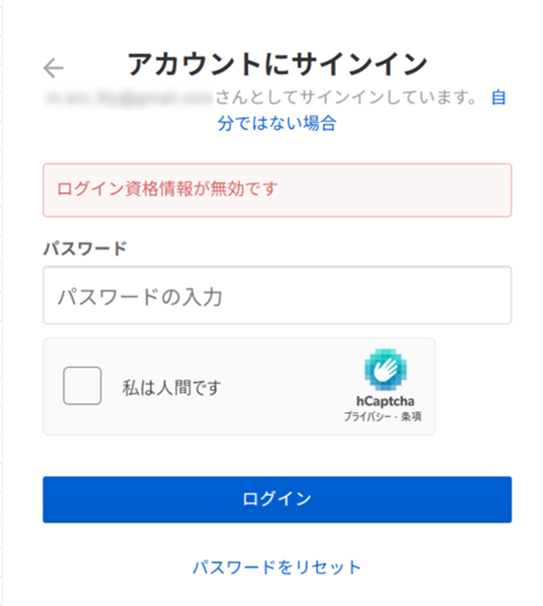 パスワードを5回以上間違えると下記画面の通り、[hCaptcha]が表示され、正しいパスワード入力と[私は人間です]を証明しない限りはログインできない状態となります。 ※メールアドレスが誤っている場合にもパスワード入力画面に進みますので、ご注意ください。