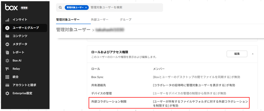 「外部コラボレーション制限」が有効化されている場合、フォルダの所有者、共同所有者は、フォルダ設定の「コラボレーショを<会社のドメイン>内に制限する」を無効化できません。そのため、会社のBox管理者に、管理コンソール>ユーザーとグループにて該当ユーザーの「外部コラボレーション制限」の設定を無効化に変更することを、ご依頼ください。