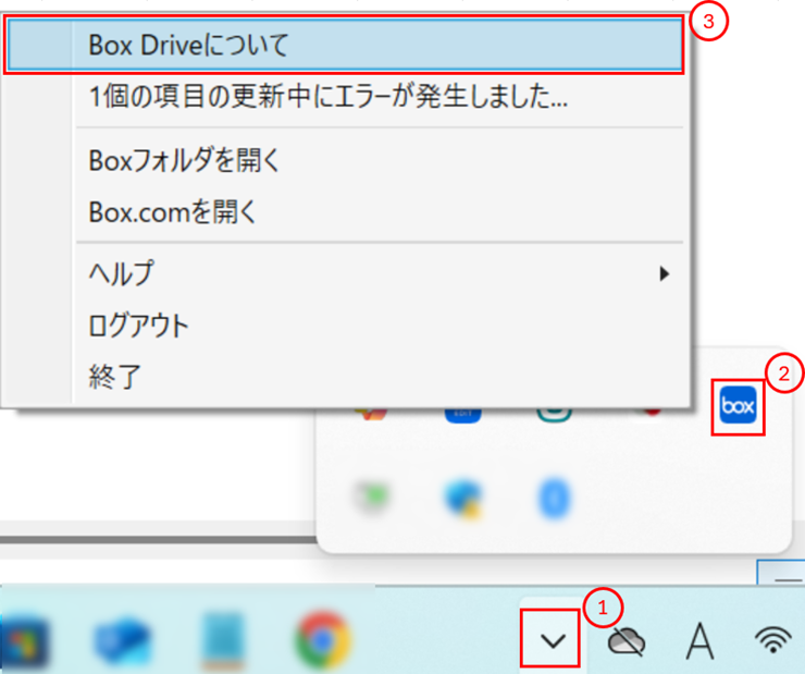 - Box Driveからログアウト(タスクバーアイコン右クリック → 「ログアウト」)