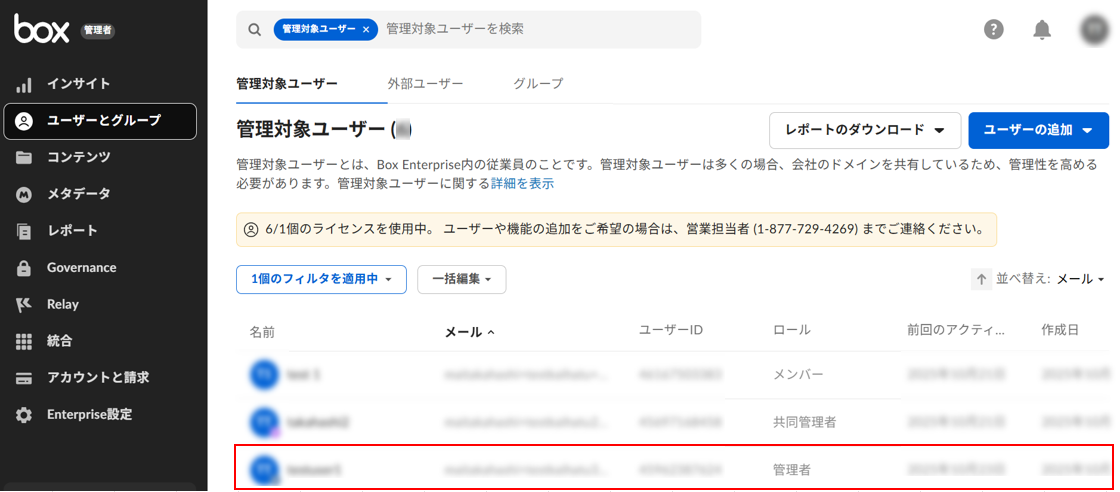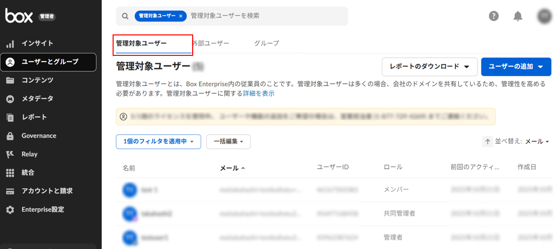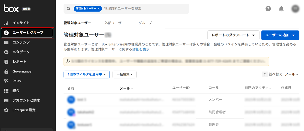 1. 組織のBoxアカウントの管理者としてログインし、[管理コンソール(組織全体の設定を行う管理画面)] > [ユーザーとグループ] に移動します。