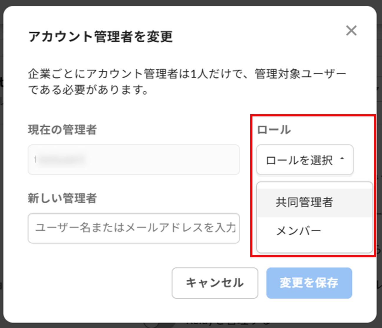 6. 現在の管理者アカウントの変更後のロールを選択します。自分を[共同管理者(副管理者として管理権限を保持)]に設定して管理権限を保持するか、一般ユーザー同様に[メンバー]に設定して管理権限を削除することができます。