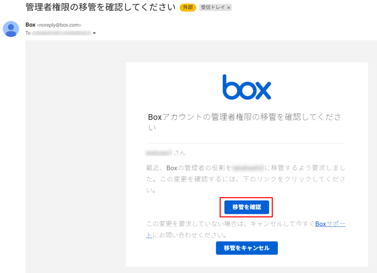 9. 既存の管理者に、変更を確認するためのメール通知が送信されますので、[移管を確認]をクリックします。