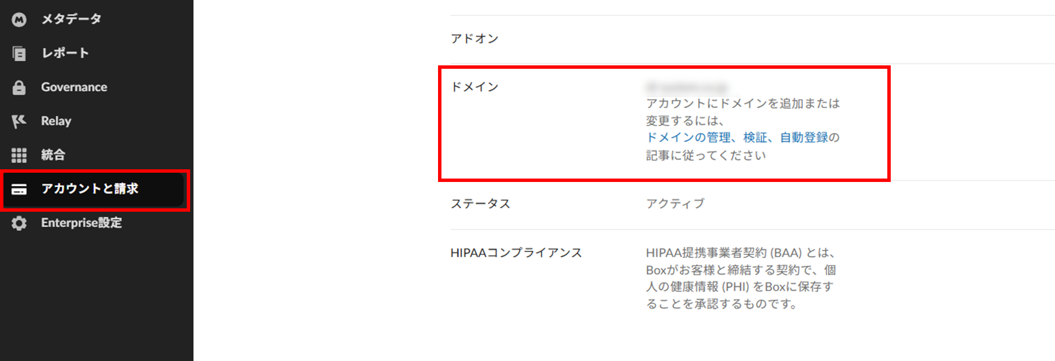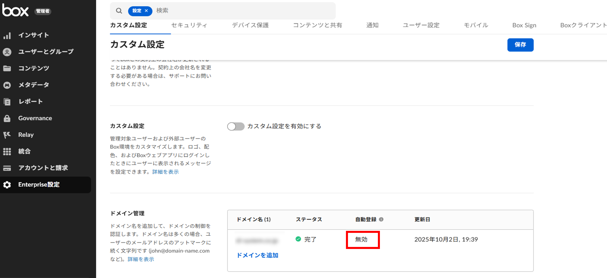 管理コンソール > Enterprise設定 > カスタム設定 > ドメイン管理