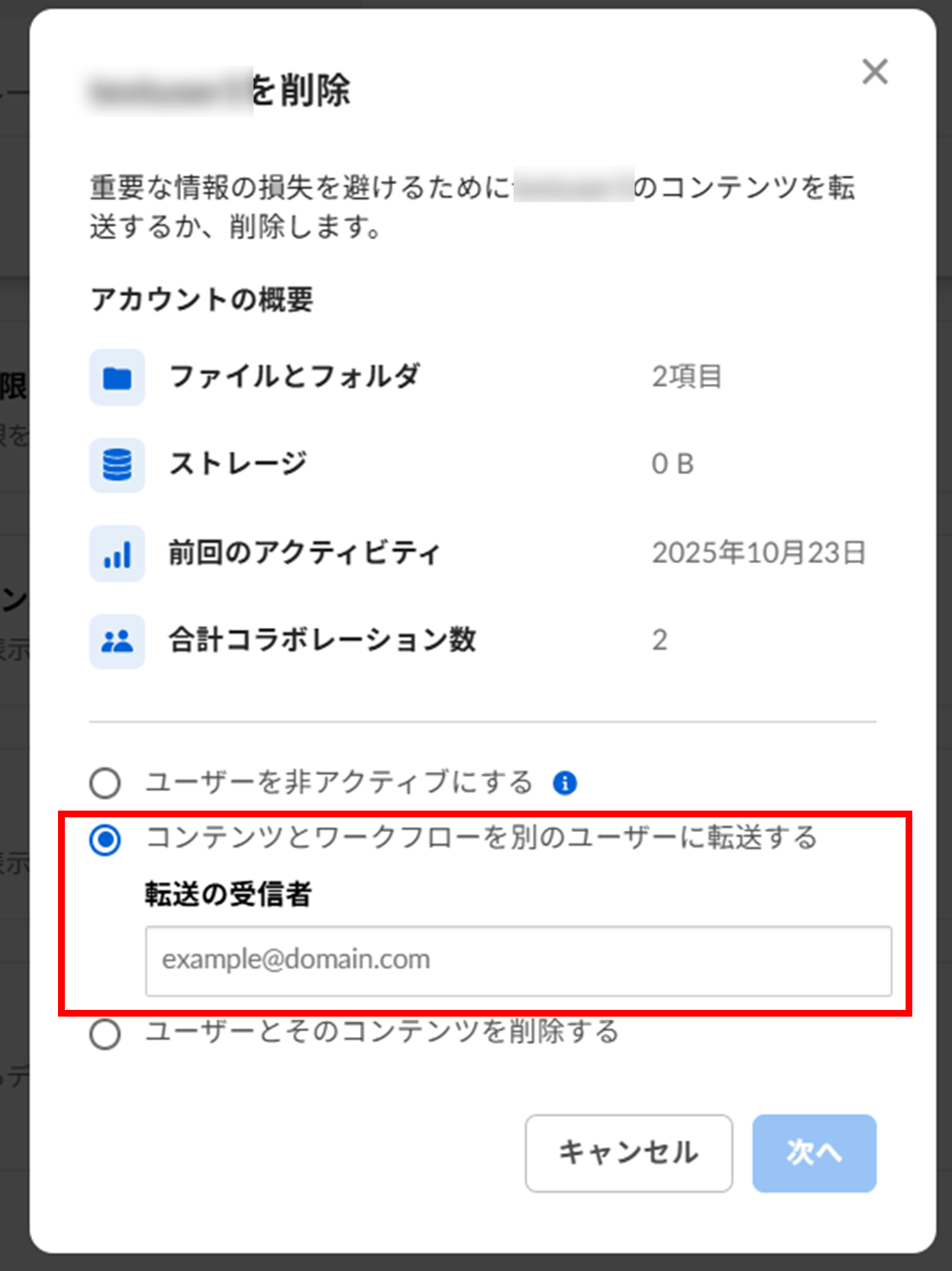 管理対象ユーザーに登録させずにコラボレーションするには、一度該当ユーザーを管理対象ユーザーから削除し、該当のメールアドレスでBoxフリーアカウントを作成してから、改めて招待し直す必要があります。