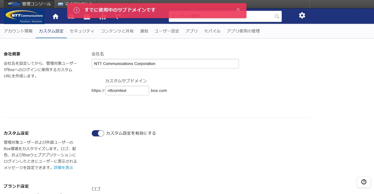 ・カスタムサブドメインは、Boxのすべての契約者において、ユニークなものを設定する必要があります。