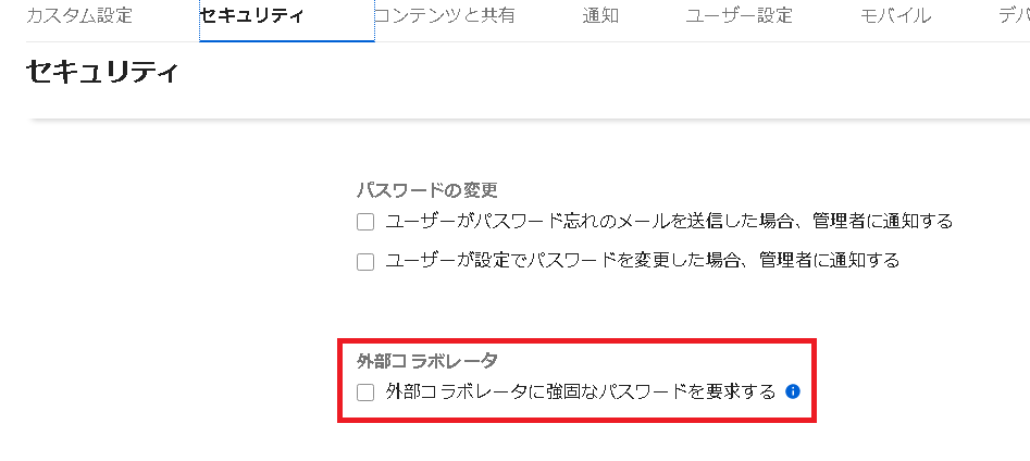 ・セキュリティタブに、「外部コラボレータ(参加者)に強固なパスワードを要求する 」を有効にすることで、招待したフォルダへアクセスしようとした際にパスワードを強固にするよう求めることができます。