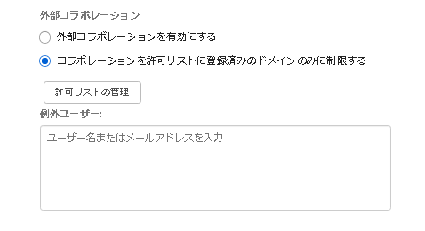 管理コンソール>Enterprise設定内のコンテンツと共有タブ内には、外部コラボレーションにホワイトリストを管理という設定メニューがあります。