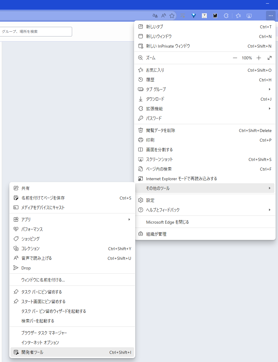 1.Microsoft Edgeで、...をクリックし、その他のツール > 開発者ツールをクリックします。