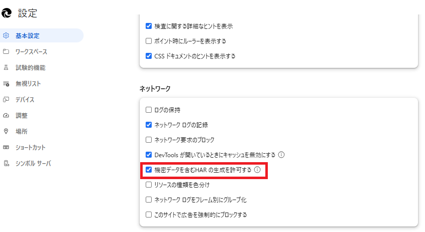 3.基本設定のネットワークセクションにある機密データを含むHARの生成を許可するのチェックボックスをオンにします。