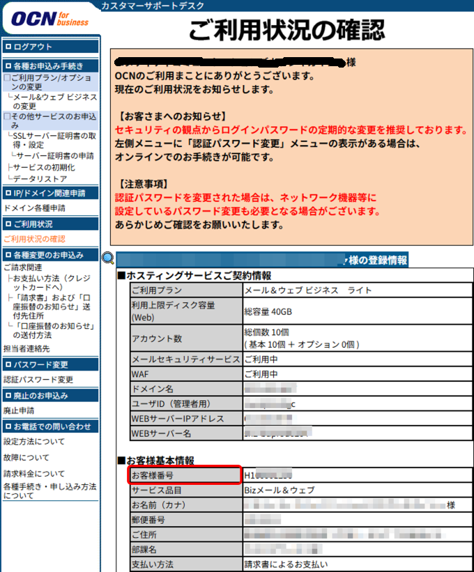 ご契約時に当社より発行された『ご利用内容のご案内』または、オンラインページの『カスタマーサポートデスク』でご確認いただけます。