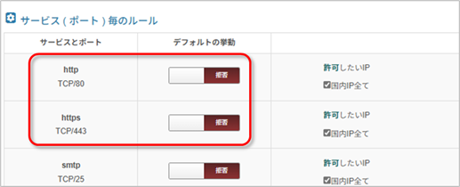 コントロールパネルの「IPアクセス制限」でhttp(TCP:80)/https(TCP:443)を[拒否]に設定すると、海外IPのアドレスからはアクセスできません。