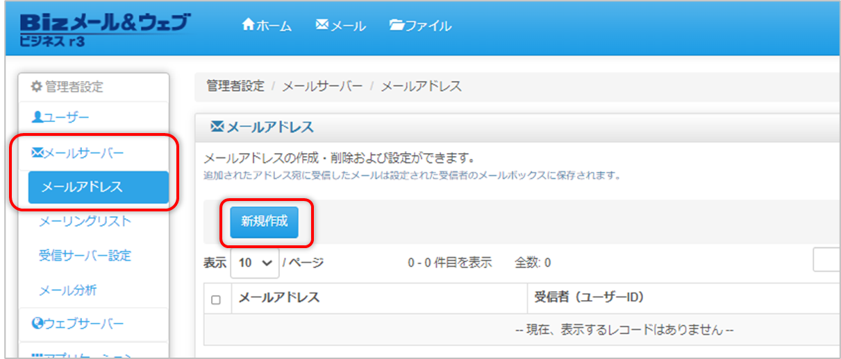[2]左メニューの[メールサーバー>メールアドレス]をクリックしてメールアドレス画面を開き、[新規作成]をクリックする