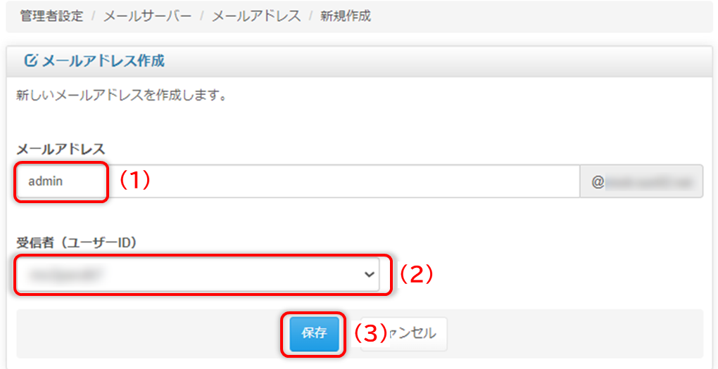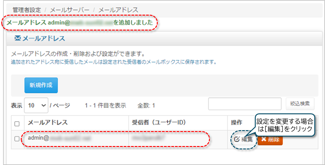 ・一覧にメールアドレス「admin@ドメイン」が表示され、[受信者(ユーザーID)]に間違いがない