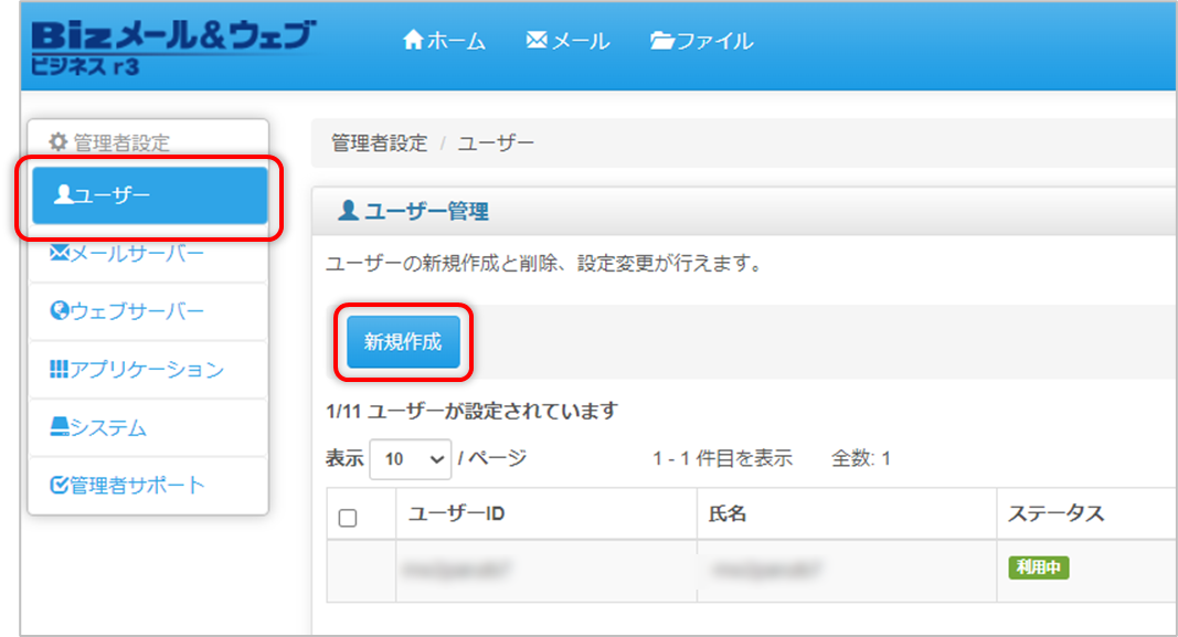 [2]左メニューの[ユーザー]をクリックしてユーザー管理画面を開き、[新規作成]をクリックする