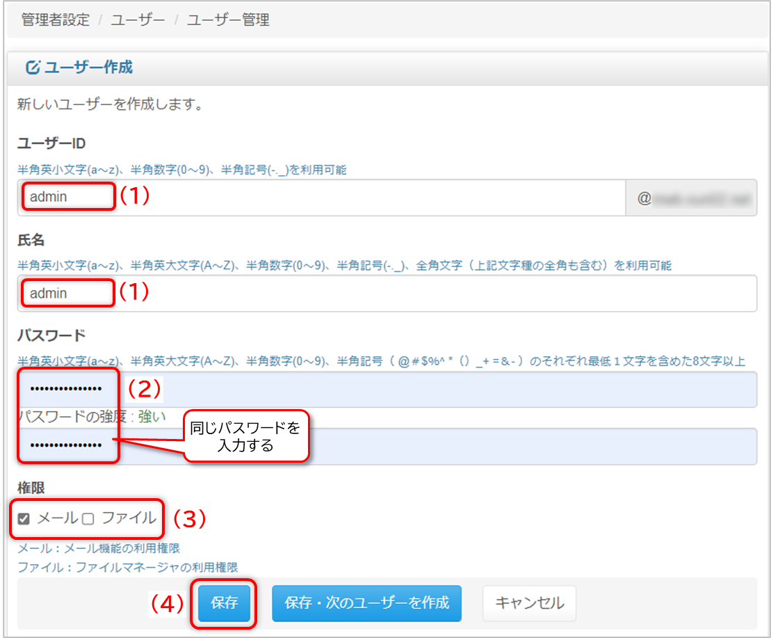 (1)[ユーザーID]と[氏名]に「admin」を入力します。