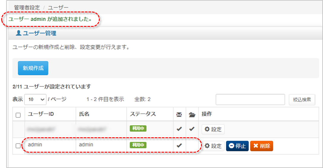・一覧にユーザーID「admin」が表示され、メール権限にチェックマークが表示されている