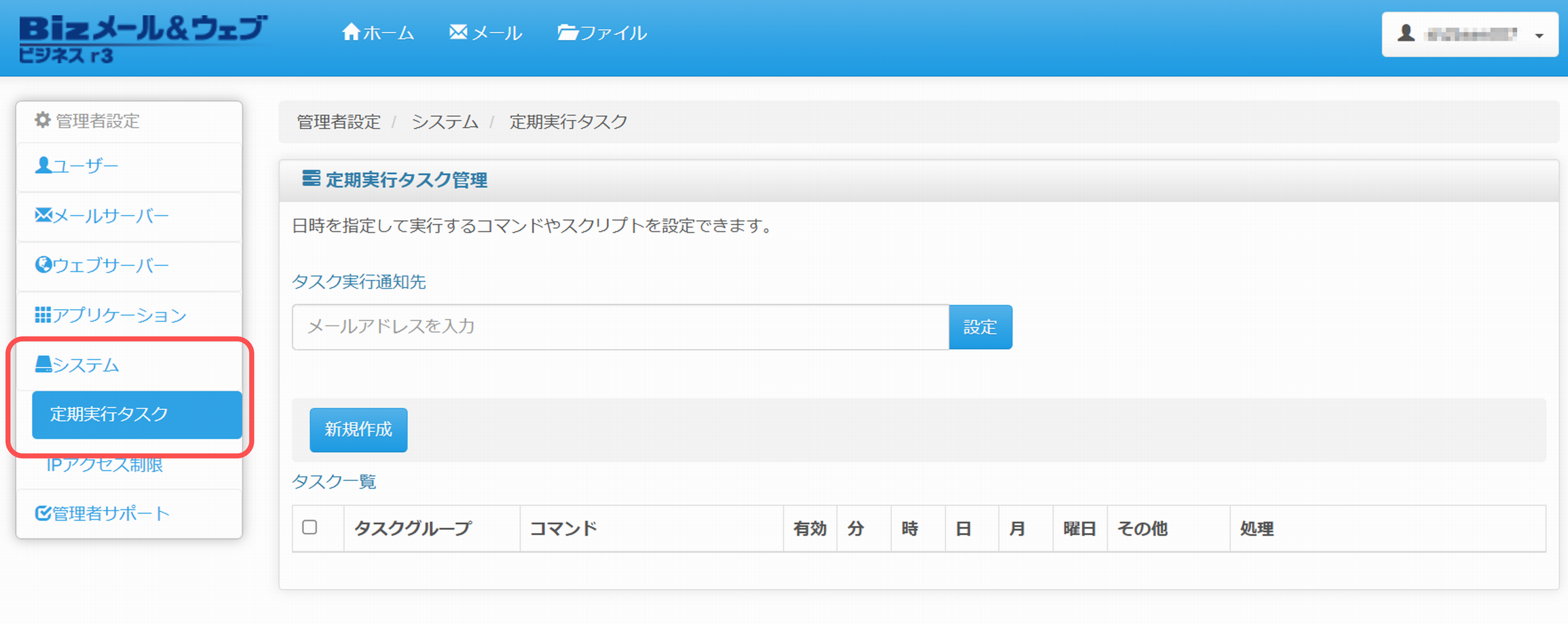 定期実行タスクの利用状況については、Biz メール&ウェブビジネスr3のコントロールパネルにてご確認いただけます。