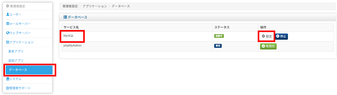 2)コントロールパネルの左メニュー「アプリケーション」から、[データベース]をクリックし、MySQLの設定ボタンをクリックします。