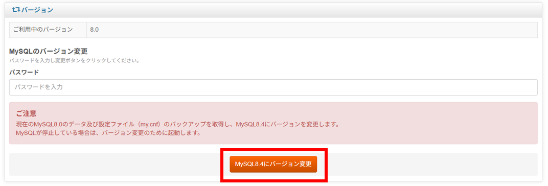 3)ページの下部に[⇔バージョン]が表示されますので、[MySQL8.4にバージョン変更]ボタンを押して、MySQL8.4へバージョンを変更してください。