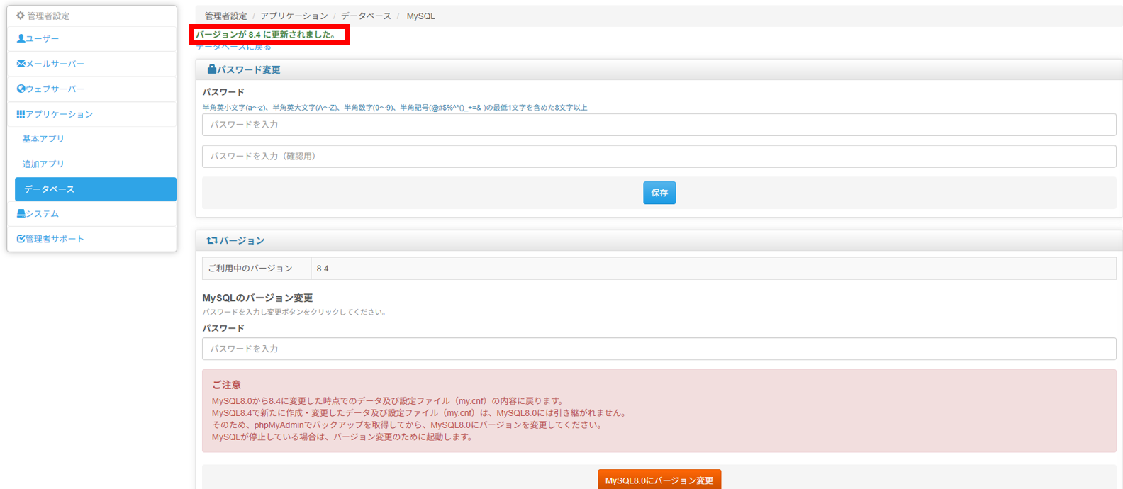 MySQL8.4への変更に伴い、MySQL8.0でご利用のデータベースは引き継がれますが