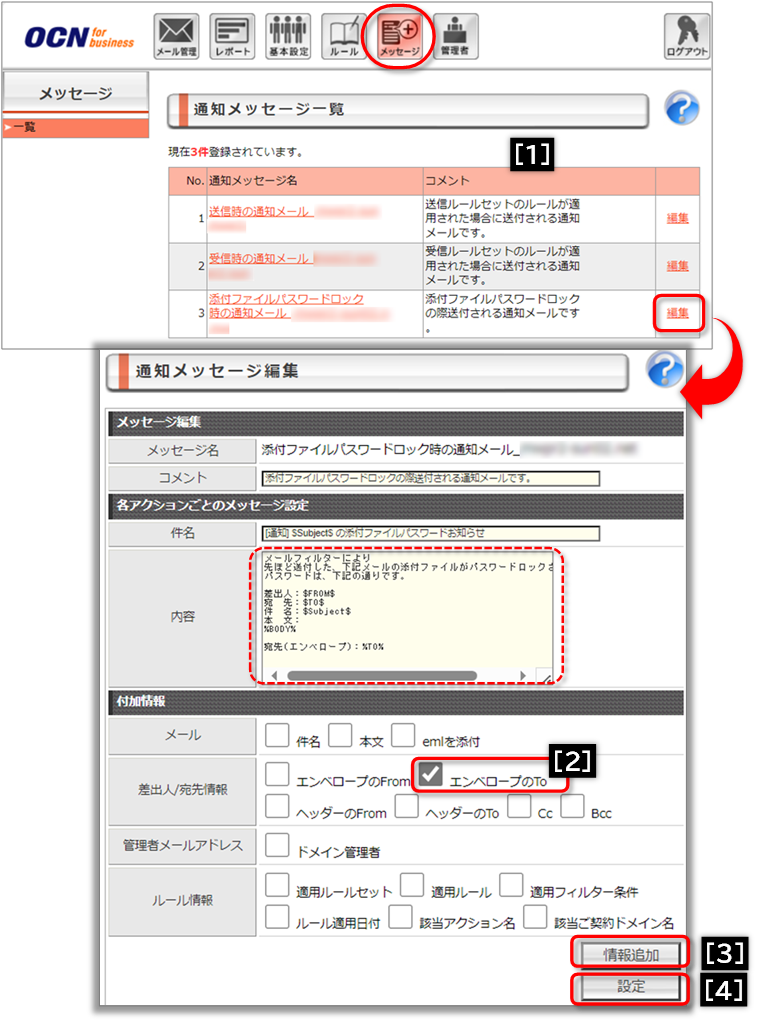 [2]「添付ファイルパスワードロック時の通知メール」の[編集]をクリックして「通知メッセージ編集」画面を開きます。
