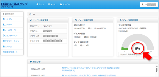 ※ ディスク使用量(%)は、コントロールパネル[ホーム]画面右側の「リソース使用状況」で確認できます。