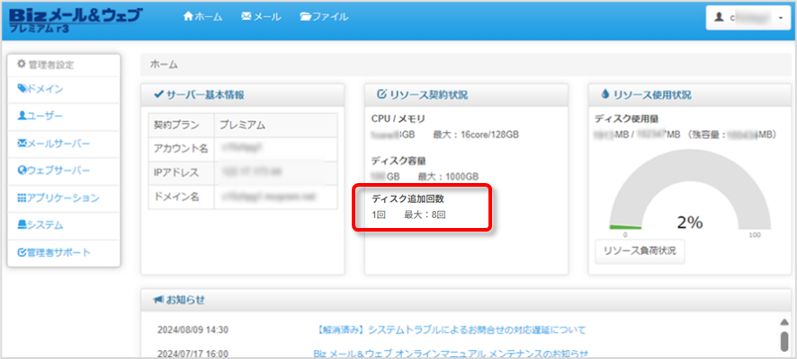 コントロールパネルに表示される「ディスク追加回数」が「8回」になるまでディスク追加のお申込みが可能となりますので、現状のディスク追加の回数を確認する場合は、コントロールパネルをご参照ください。