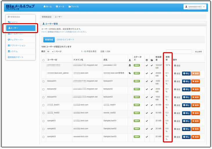 ユーザーやドメイン管理者の割り当て容量に対する使用率は、「ユーザー管理」画面にてご確認いただけます。
