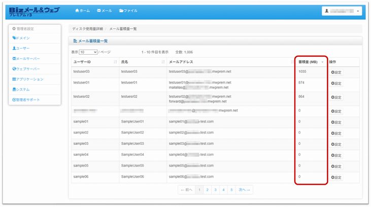 ユーザーごとのメール使用量は、管理者がコントロールパネル内の「メール蓄積量一覧」画面にてご確認いただけます。