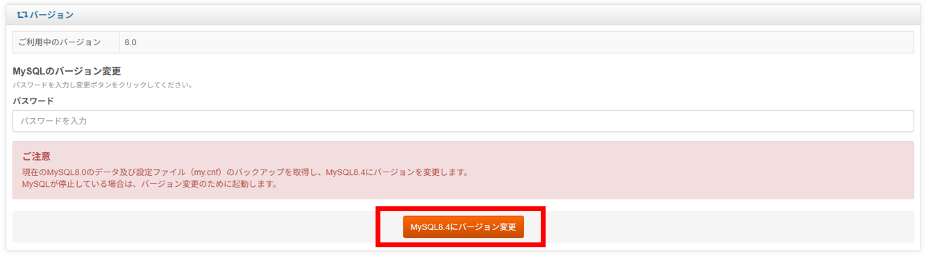 3)ページの下部に[⇔バージョン]が表示されますので、[MySQL8.4にバージョン変更]ボタンを押して、MySQL8.4へバージョンを変更してください。
