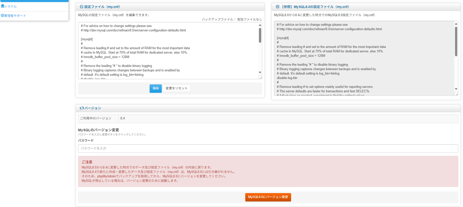 2. MySQL8.4からMySQL8.0に切り戻しを行う場合、phpMyAdminでバックアップを取得後、MySQL8.0へ変更してください。