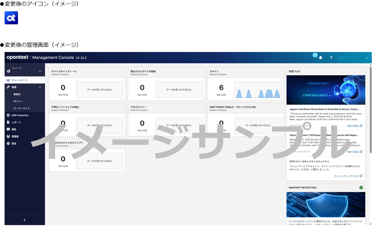 各画面のアイコンやロゴ、名称が「WEBROOT」から「opentext」に変わります。