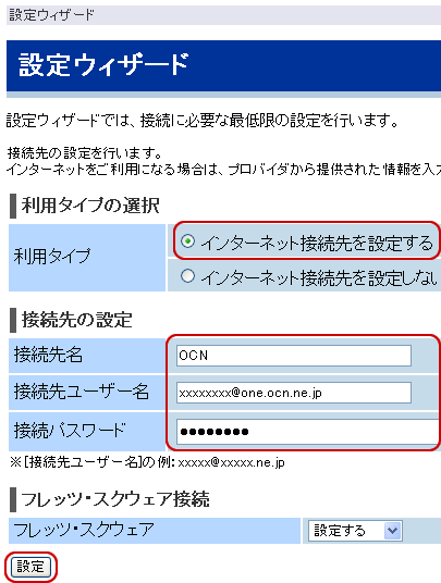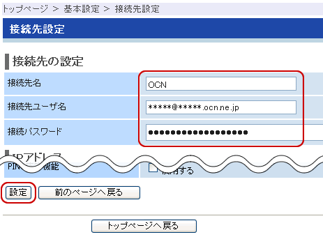 | 接続パスワード | OCN接続用パスワード(認証パスワード)を入力 |