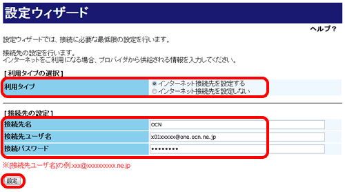 | 利用タイプ | [インターネット接続先を設定する]を選択 |