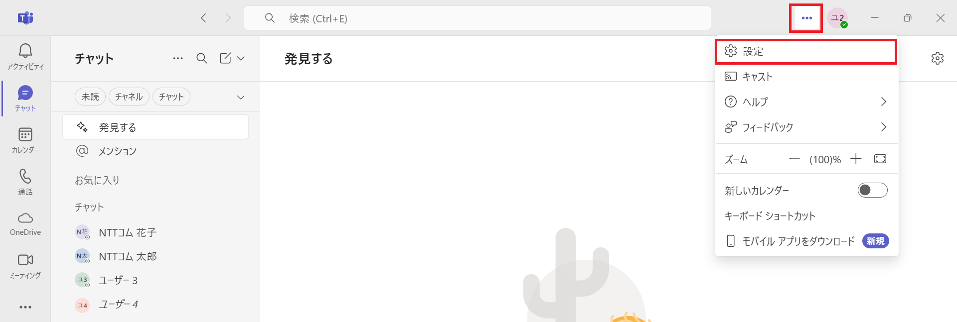 1.Teams 画面の右上の...3点リーダー(設定など)をクリック>[設定]をクリック