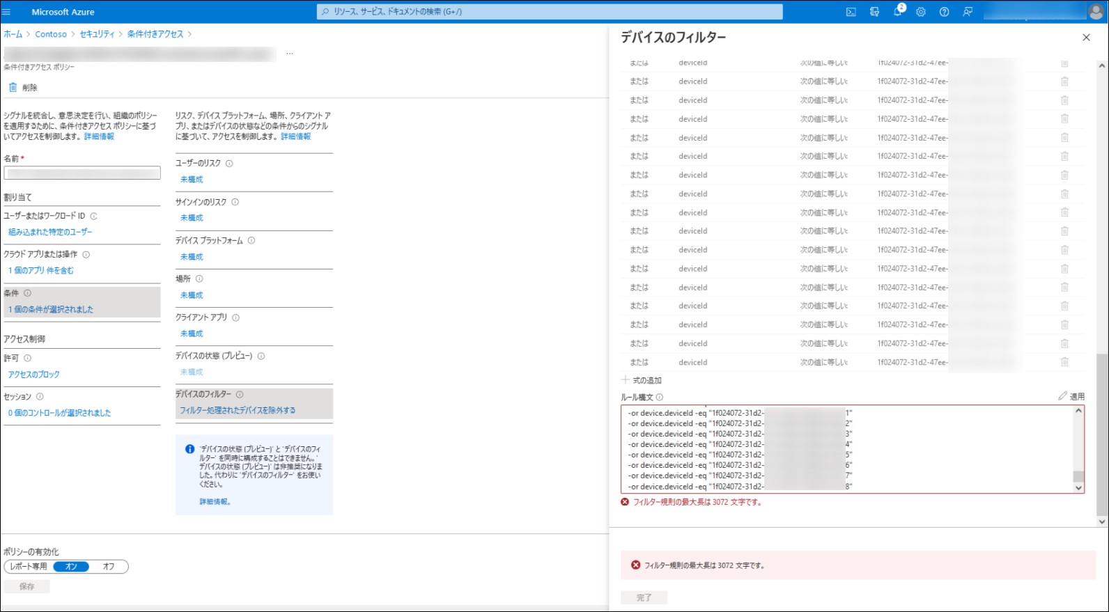 条件付きアクセスでは、デバイスのフィルターの文字数の上限に加え、個別ポリシーの設定全体の容量に上限があります。内部的に条件付きアクセス ポリシーは JSON で設定が管理されており、この JSON の最大サイズは現状25.6KB です。